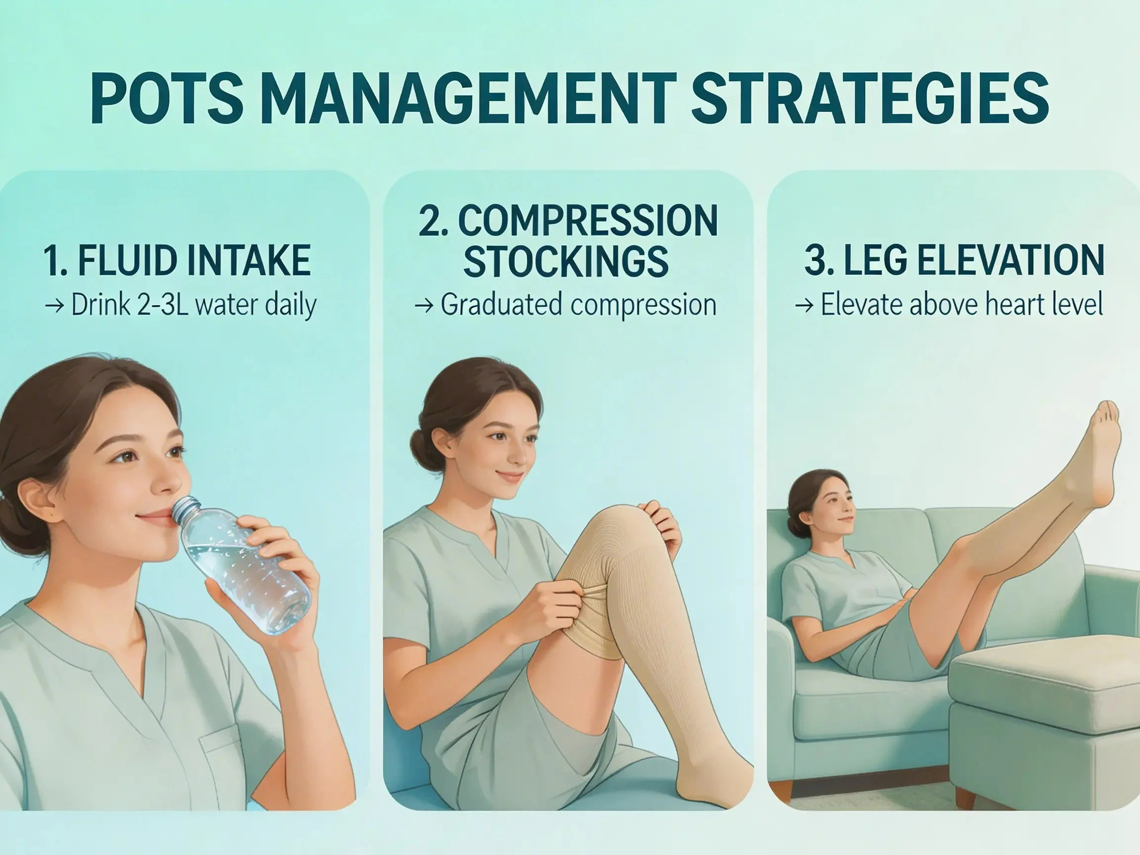 Managing POTS often involves a combination of lifestyle adjustments and personalized care. Many people benefit from increasing fluid intake and, when advised by a healthcare provider, adjusting salt intake to help support blood volume. Compression garments can help improve circulation in the legs, and elevating the legs while resting may reduce blood pooling. Gentle, gradual movement and pacing activities throughout the day can help conserve energy and reduce symptom flare-ups. Because POTS affects each person differently, working with a healthcare provider to create an individualized management plan can be an important part of improving quality of life and finding what works best for each individual.